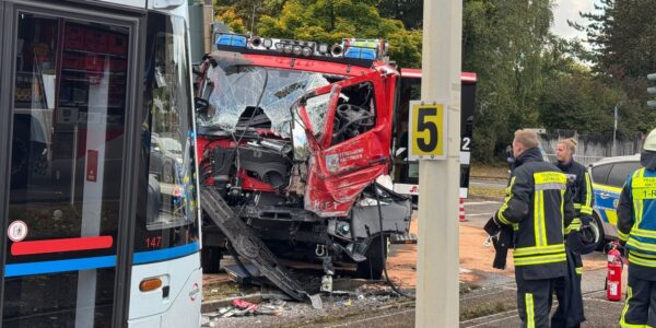 Ein Löschfahrzeug der Feuerwehr Hattingen rückt zu einem Einsatz aus. An einer Kreuzung kollidiert das tonnenschwere Fahrzeug mit einer Straßenbahn. Laut Polizei werden fünf Menschen verletzt. Auf einer Einsatzfahrt mit Blaulicht ist ein Löschfahrzeug der Feuerwehr an einer Kreuzung in Hattingen (Ennepe-Ruhr-Kreis)…