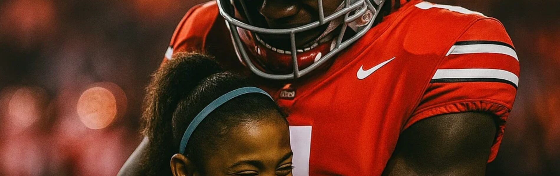 Emma turned, saw Jeremiah smiling back at her, and ran to hug him. That moment — a young girl wrapped in the arms of her hero, tears streaming down her face — became an instant symbol of what college football is truly about.