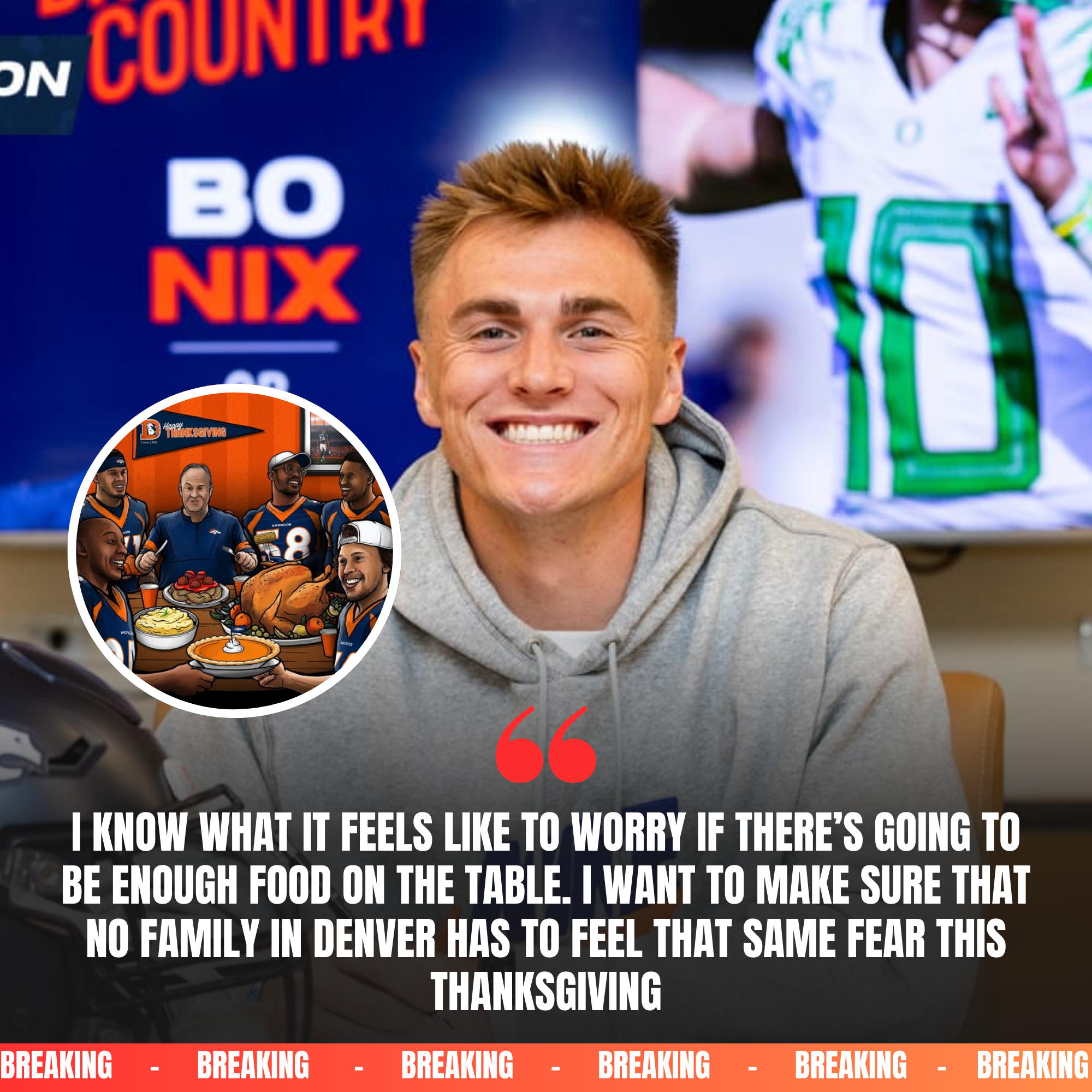 In a remarkable display of generosity and heart, Bo Nix, quarterback for the Denver Broncos, announced a $3 million donation to support low-income families across Denver this Thanksgiving. The decision has left Broncos Nation in awe, not only for the sheer scale of the contribution but also for the deeply personal story that inspired it—a story rooted in his own challenging childhood.