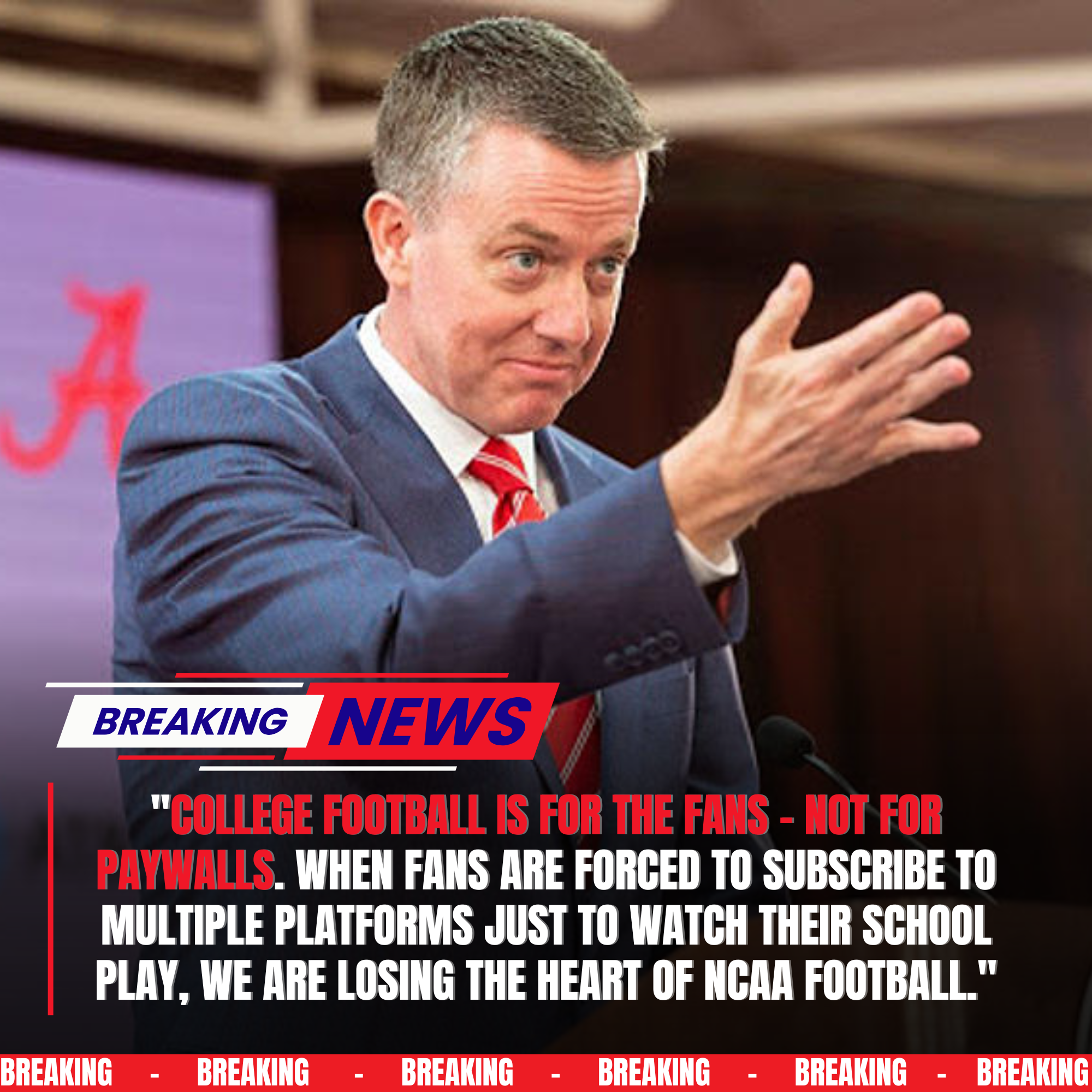 What began as quiet frustration inside Alabama’s football circles has now exploded into one of the most consequential debates in modern college sports. Officials, boosters, and key stakeholders connected to the Alabama Crimson Tide are publicly criticizing the rapidly expanding web of expensive streaming services and subscription platforms required to watch full NCAAF games.