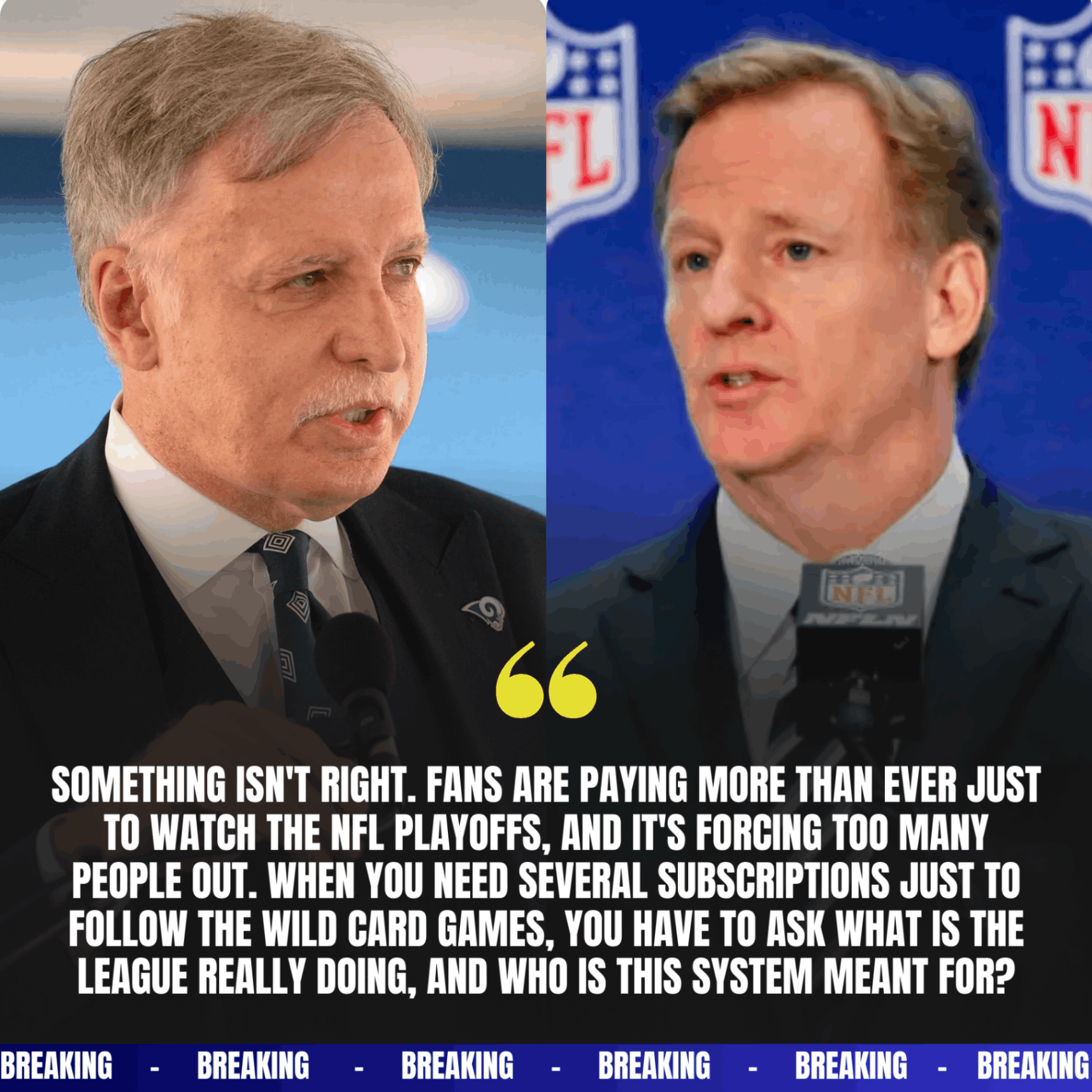 “NFL playoffs are becoming too expensive,” Kroenke said. “We have to ask ourselves a hard question. Is the league still putting fans first, or has profit overtaken passion?”