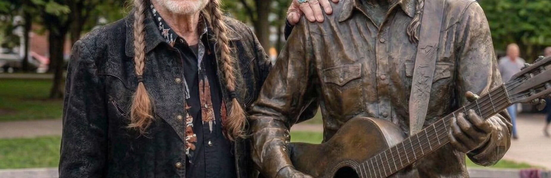The sculpture depicts Nelson in one of his most recognizable poses: standing with his legendary guitar “Trigger,” wearing his signature bandana, long braids resting over his shoulders.