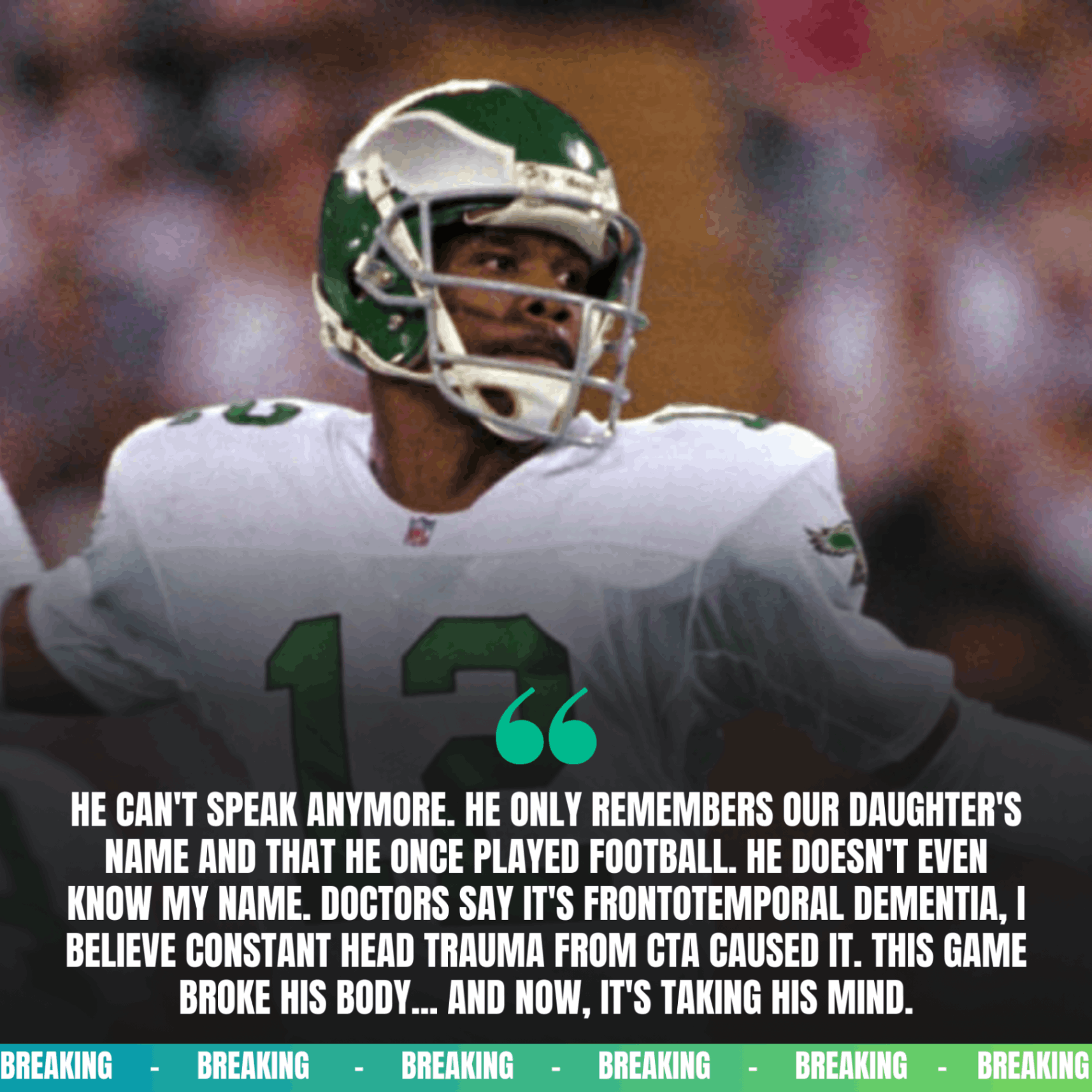 “He can’t speak anymore. He only remembers our daughter’s name and that he once played football. He doesn’t even know my name. Doctors say it’s Frontotemporal Dementia, I believe constant head trauma from CTA caused it.This game broke his body… and now, it’s taking his mind.”