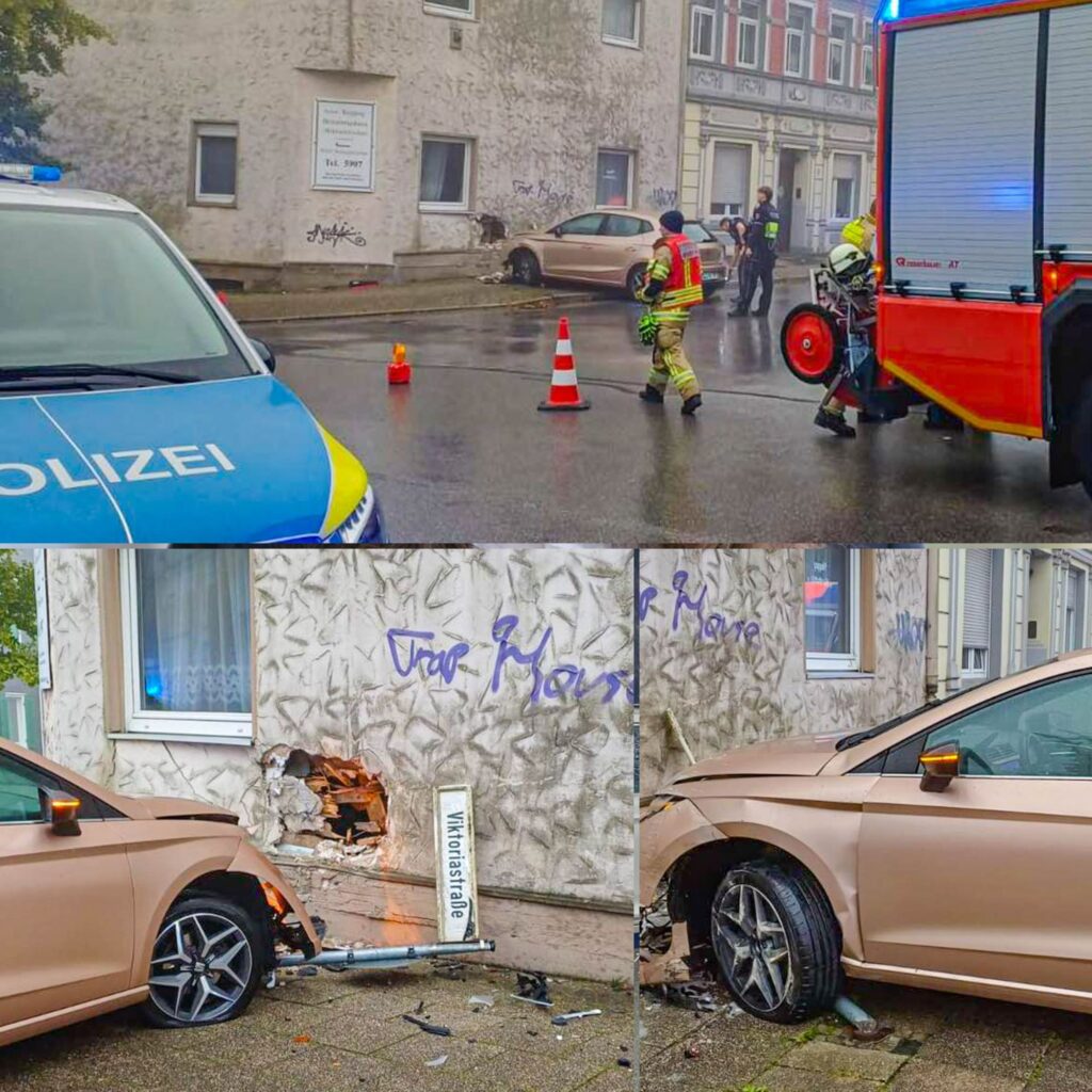 Ein PKW kam in einem Kreuzungsbereich von der Straße ab und prallte gegen die Fassade eines Hauses. Die Fahrerin des Fahrzeugs wurde verletzt. Die im Gebäude anwesenden Personen blieben unverletzt.