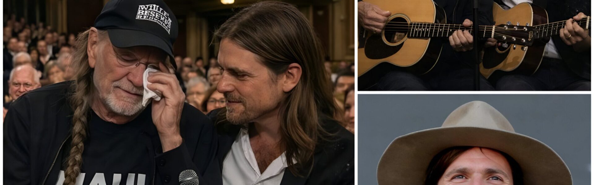 As the lights dimmed further, the opening chords of “Wish You Were Here” resonated softly through the theater. They weren’t played by Willie himself, as the audience may have expected. Instead, the soft strumming came from a younger figure stepping confidently onto the stage — Willie Nelson’s own son. The atmosphere shifted immediately. There was an unmistakable tension, a quiet anticipation that carried the weight of decades of family history. Every person in the room seemed to hold their breath, sensing that something beyond a mere performance was about to unfold.