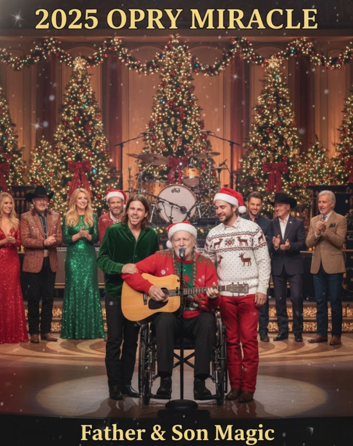 On Christmas Eve 2025, under the warm glow of festive lights and hushed reverence, the Grand Ole Opry witnessed a moment that felt less like a performance and more like a blessing. Willie Nelson stepped into the historic circle — where country legends are immortalized — but this time, he wasn’t alone. Standing beside him was his son, Lukas Nelson, ready to share a duet that would leave the entire audience breathless.