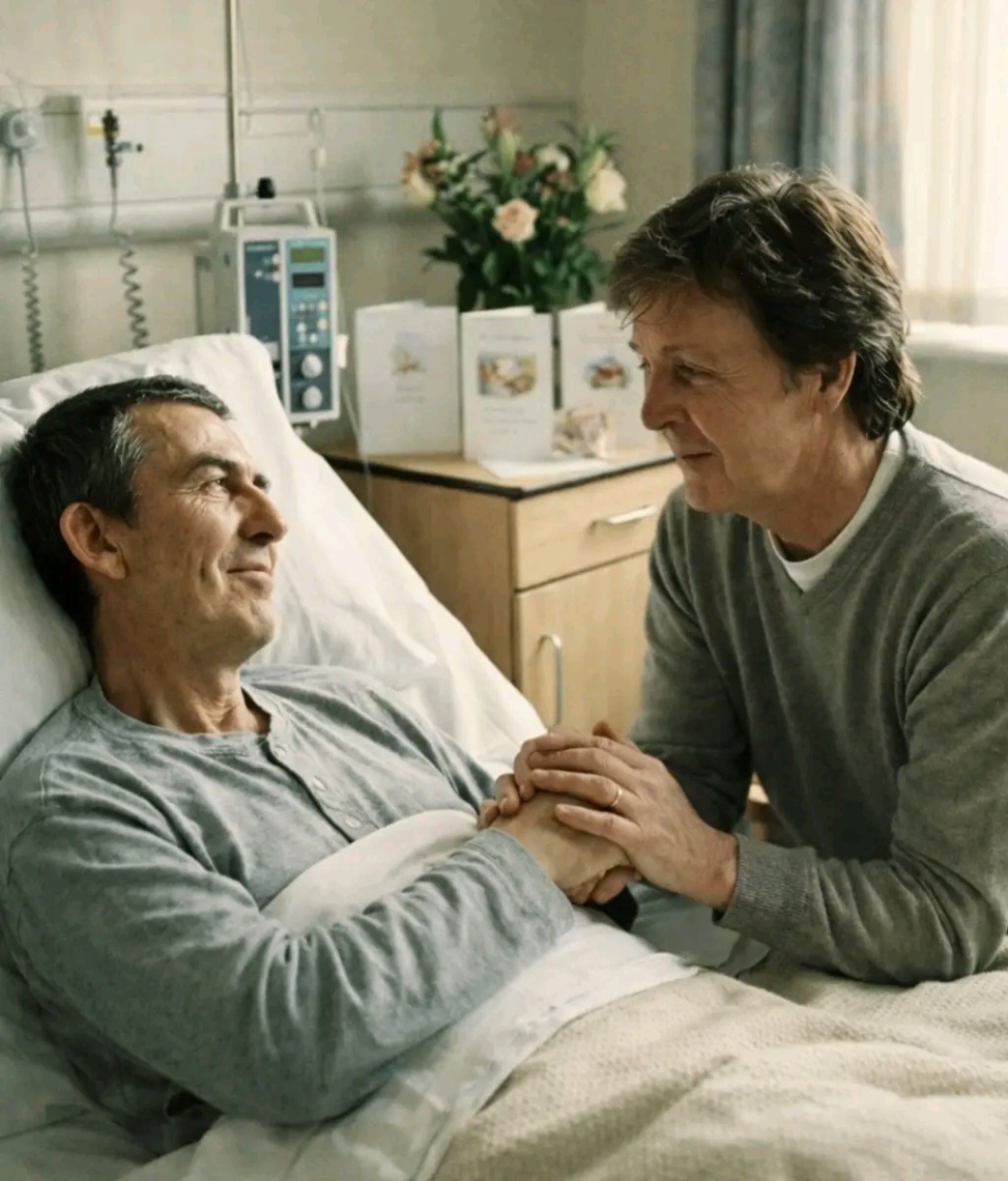 A short, unedited video — believed to have surfaced online by mistake — is quietly circulating among Beatles followers, stirring emotion not through what it shows, but through what it withholds. The clip is said to capture Paul McCartney standing alone in a hospital corridor, moments before being allowed to enter the room of George Harrison during the final days of George’s life. It ends abruptly. No greeting. No embrace. No farewell. Just silence — and the weight of history suspended in a hallway.
