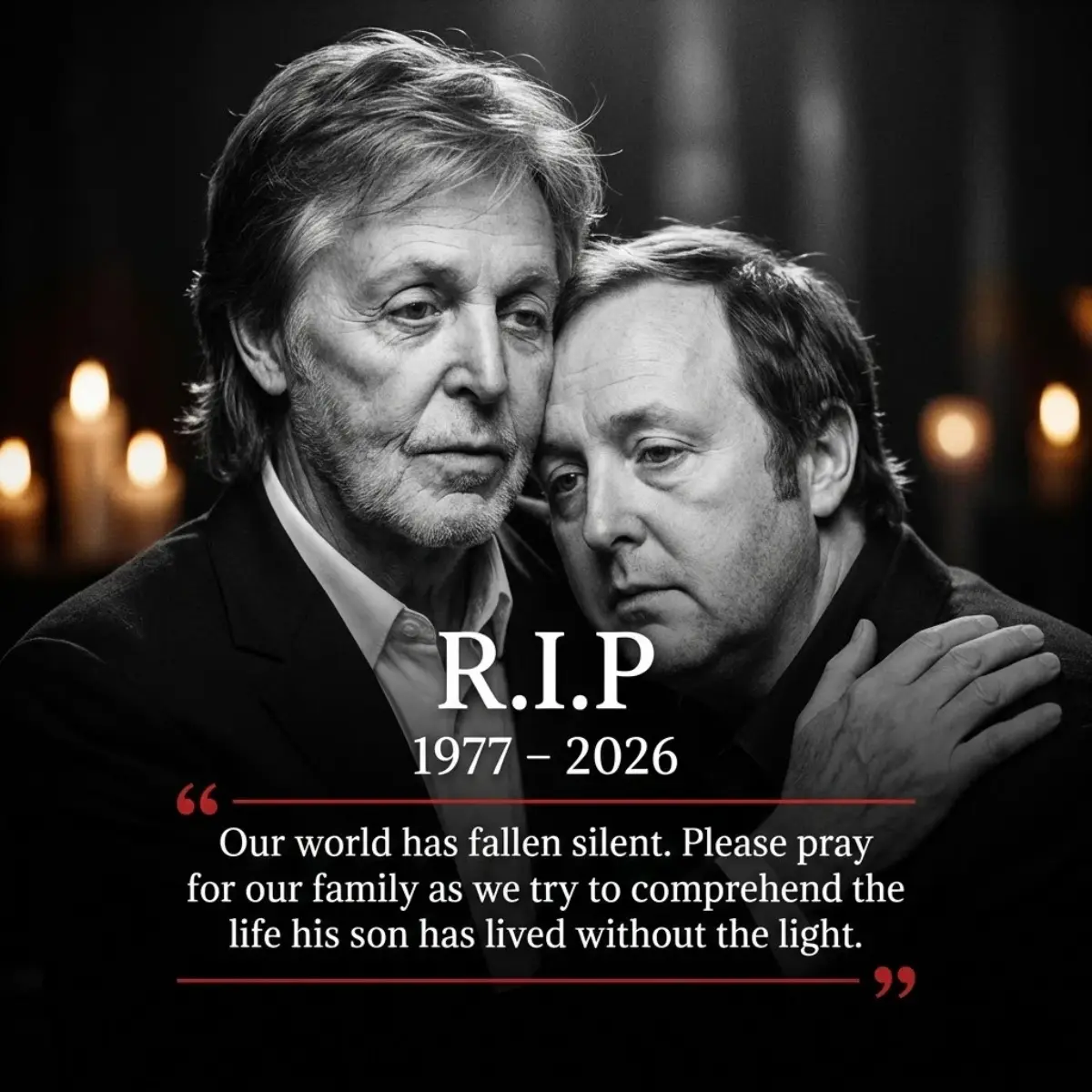 Thirty minutes ago, a wave of silence fell across Nashville, Tennessee—an abrupt hush that seemed to swallow the city’s usual hum. In a brief, carefully worded statement released through a family spokesperson, the McCartney family announced that the 48-year-old son of Paul McCartney had passed away earlier this evening. No details were offered. No cause was confirmed. Only a single sentence, heavy with restraint, landed like thunder across the music world.