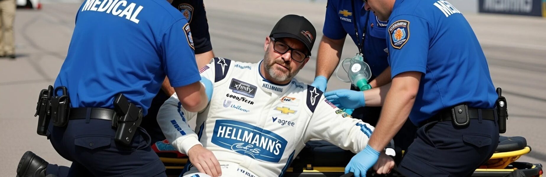 Moments after removing his helmet, observers said the veteran driver appeared visibly exhausted. He reportedly leaned briefly against the side of the car before suddenly collapsing, prompting immediate action from nearby crew members and NASCAR medical personnel.