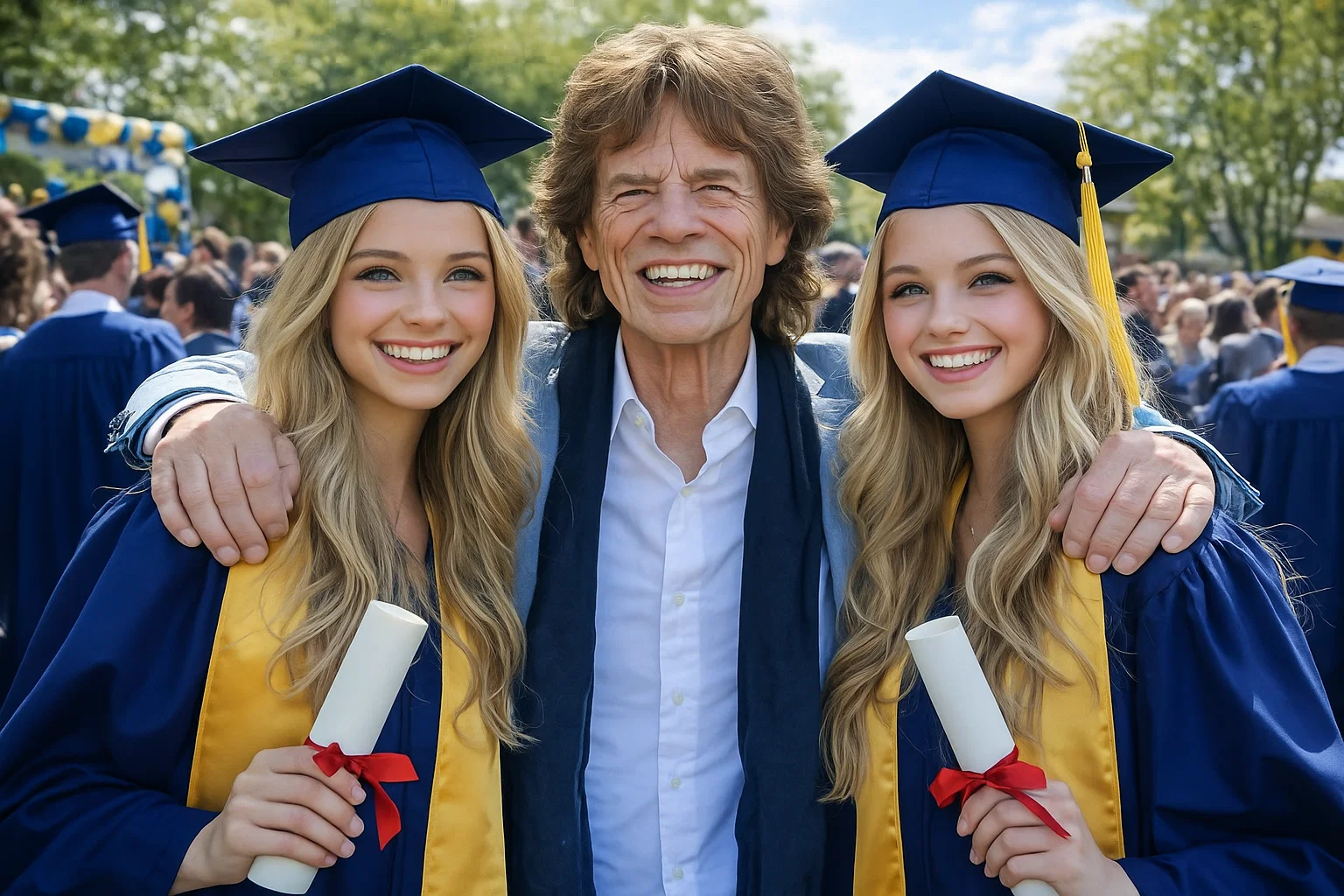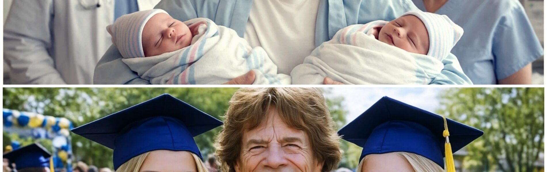 A sentimental story spreading rapidly on social media claims that 18 years ago Mick Jagger discovered two abandoned newborn twin girls near a church outside Dartford, Kent, chose to raise them, and has now appeared with them in a joyful graduation photo that left an entire room in tears. The post, written in the familiar style of viral “you won’t believe what happened next” narratives, presents the Rolling Stones frontman as a reluctant guardian turned devoted father figure, culminating in a staged, feel-good moment at a graduation ceremony.